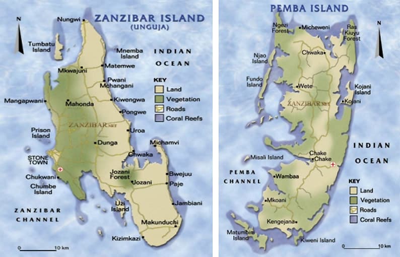Zanzibar forme un archipel composé des îles principales Zanzibar (Unguja) et Pemba, ainsi que de plusieurs îlots, au large de la Tanzanie, à 36 kilomètres du continent. L’appellation Zanzibar désigne à la fois l’île principale et l’ensemble de l’archipel.